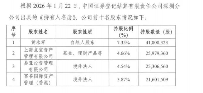 东方通2026年3月2日披露的投资风险分析报告显示,截至2026年1月22日的前十大股东中,除黄永军外,其余九名股东均为新晋面孔,其中点宝资产持股4.66%,易亚投资持股4.54%,安瑞升及其子公司合计持股4.97%。