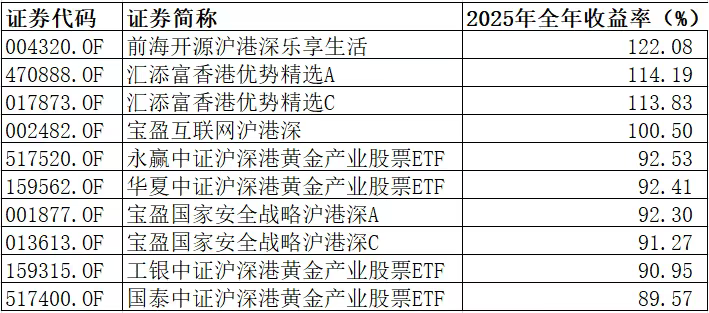 受到 黄金 价格提振因素的影响,平安、国泰、易方达、南方等多只中证沪深港黄金产业指数基金在2025年表现良好,全年收益率均超过了80%;同时,投资港股 芯片 、 新能源 汽车的宝盈国家安全战略沪港深A,投资港股医药的中银港股通医药A,投资港股互联网等板块的天弘中证沪港深 云计算 产业ETF、华泰柏瑞中证沪港深云计算产业ETF,在2025年表现突出,其收益率均超过80%。