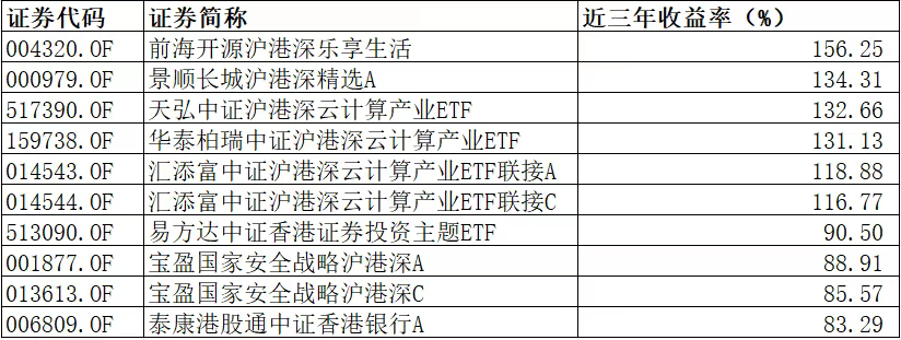 其中,截至2025年12月31日,前海开源沪港深乐享生活近三年收益率达到156.25%,表现最好;其次是 景顺 长城沪港深精选A、 天弘中证沪港深云计算产业ETF 、华泰柏瑞中证沪港深云计算产业ETF、 汇添富中证沪港深云计算产业ETF 联接A等,近三年收益率均实现翻倍。