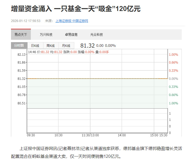 产品收益短期大涨,似乎是最好的广告。据《上海证券报》报道,1月12日,单蚂蚁基金一个渠道,申购这只基金的资金就有120亿元。