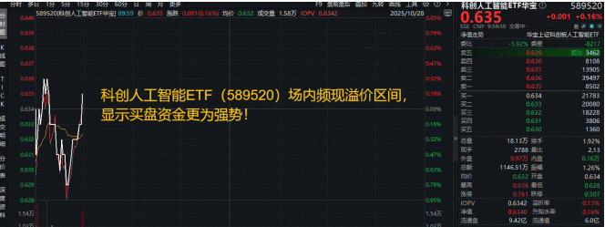 今日(10月28日)重点布局国产AI产业链的科创 人工智能 ETF(589520)在水面附近震荡,场内涨幅盘中摸高0.32%,现涨0.16%,场内频现溢价区间,显示买盘资金更为强势。