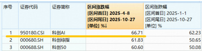 4、收益亮眼,显著领跑:拉长时间来看,科创人工智能ETF(589520)标的指数自本轮低点(4月8日)以来,累计上涨66.71%,跑赢市场热门的科创板宽基指数,如 科创综指 (61.83%)、 科创50 (60.60%)等。
