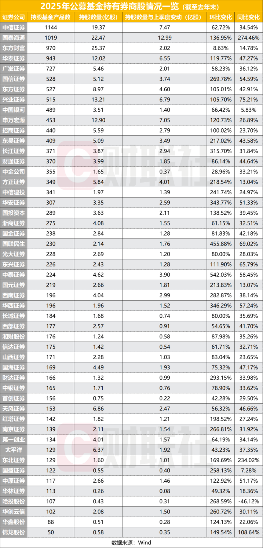 在本轮加仓潮中,部分中小市值券商股展现出更强的持仓弹性。数据显示, 中泰证券 年末公募持股数量为4.62亿股,虽然绝对规模不及头部机构,但环比增幅高达542.03%,同比增幅也达到58.45%,在全部上市券商中增速居前。