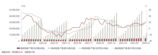 2026年一季度,国内 集成电路 产量同比增长24.3%,人工智能等新技术的规模化应用,为芯片产业打开了广阔的内需增长空间,也为国产替代提供了坚实市场支撑。