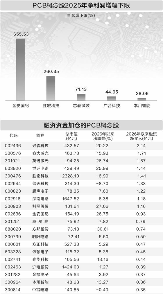 随着行情持续向好,PCB板块获得资金青睐。据数据宝统计,截至1月20日,2026年以来PCB概念股合计获融资净买入16.74亿元,其中9股获净买入金额超过1亿元, 兴森科技 、 容大感光 、 英诺激光 居前,分别达到2.14亿元、1.71亿元、1.67亿元。