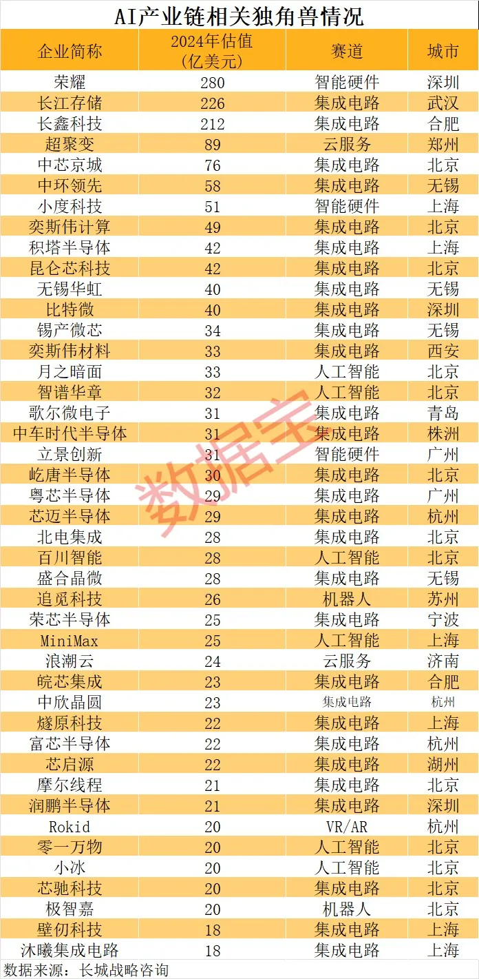 在此大背景下,芯片独角兽未来发展值得期待。近日,长城战略咨询发布《中国独角兽企业研究报告2025》, 集成电路 独角兽企业包括长江存储、长鑫科技、中芯京城、中环领先、粤芯半导体、盛合晶微、燧原科技、摩尔线程、润鹏半导体、壁仞科技、沐曦集成电路等;另外和AI产业链有关的公司有荣耀、超聚变、月之暗面、智谱华章等。