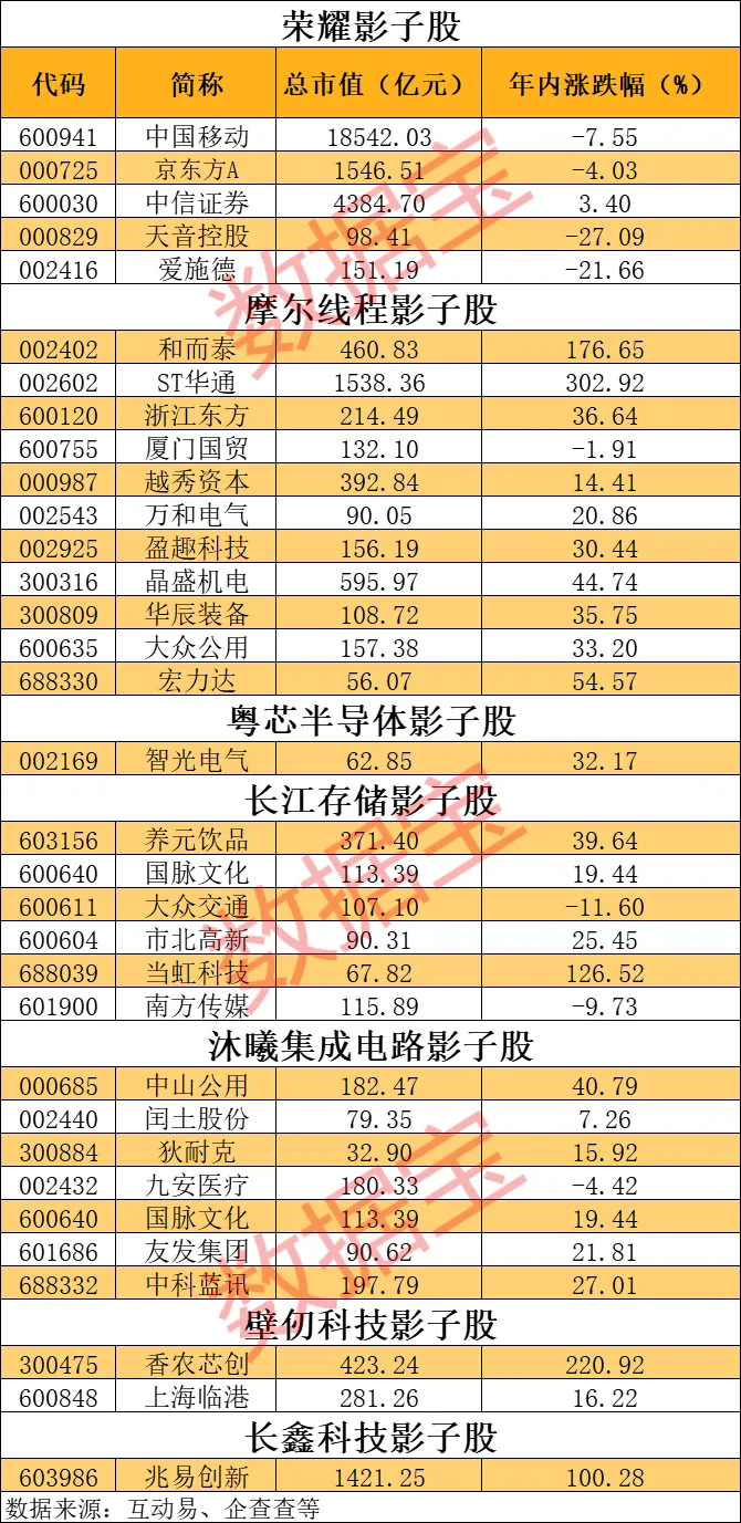 除了智云机器人影子股,摩尔线程影子股 ST华通 、 和而泰 等,上海微电子影子股 张江高科 等,也均实现股价翻倍。近期,被称为"国产 英伟达 "的摩尔线程闪电过会,或意味着越来越多的芯片独角兽有望走向资本市场,相关影子股表现值得关注。