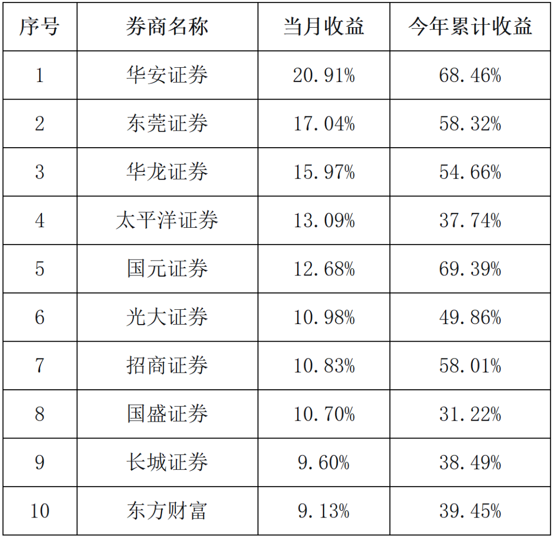 复盘9月各券商金股组合表现,每市科技数据显示,10家券商金股组合9月收益超过9%。其中, 华安证券 的金股组合以20.91%的当月收益排名第一;东莞证券9月金股表现也可圈可点,以17.04%的收益排在第二;华龙证券、 太平洋 证券、 国元证券 等券商紧随其后。