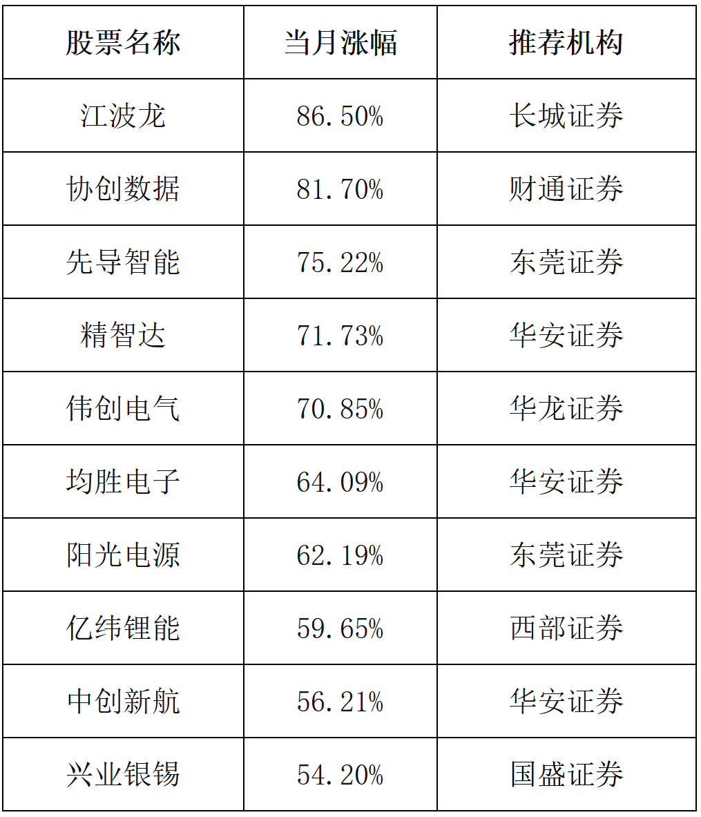 在9月金股中, 长城证券 推荐的 江波龙 当月上涨了86.5%,涨幅居于当月金股榜首; 财通证券 推荐的 协创数据 9月涨幅达到81.7%,排名第二;东莞证券推荐的 先导智能 以75.22%的月涨幅位居第三。