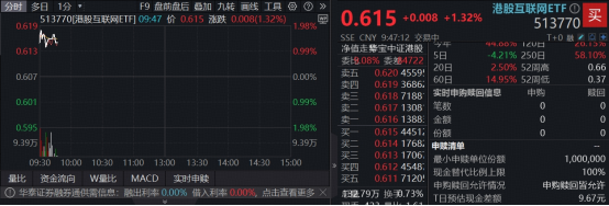 受海外扰动缓和刺激,隔夜中概强势反弹, 纳斯达克 中国金龙指数收涨逾3%。今早(10月14日)港股集体高开,科 网龙 头大面积飘红,截至发稿, 阿里巴巴-W 涨逾1%,小米集团、 腾讯控股 、 美团-W 、 快手-W 跟涨。港股AI核心工具——港股互联网ETF(513770)高开高走,场内价格现涨1.32%。