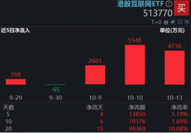 值得注意的是,近期资金借道ETF坚定增仓港股AI核心资产,彰显乐观预期。上交所数据显示,港股互联网ETF(513770)最新单日获资金净流入4738万元,近5日资金累计净流入1.37亿元。