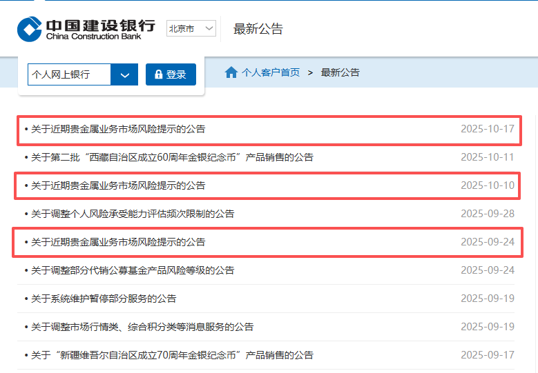 财联社记者注意到,这已是9月份底以来,建设银行在不到一个月时间里第三次向客户发布有关贵金属业务市场风险提示公告。