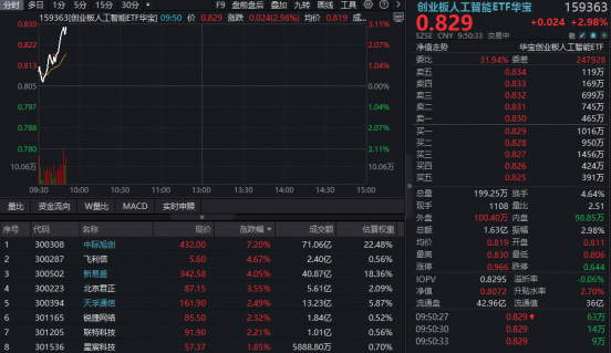 10月21日,截至9时47分,光模块含量超51%的创业板 人工智能 指数涨超2%, 中际旭创 盘中领涨超7%冲击五连涨, 飞利信 上涨4.3%, 新易盛 上涨2.9%。热门ETF方面,同标的指数规模最大、流动性突出的创业板人工智能ETF(159363)场内价格冲高超3%,收复10日线,成交额超1.5亿元。