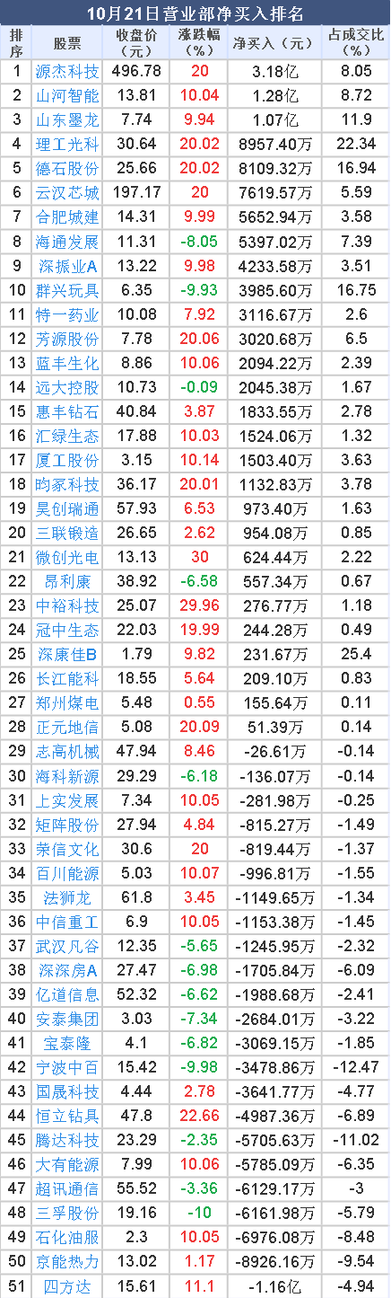 2025年10月21日, 大智慧 数据中心显示,龙虎榜中营业部净买入4.03亿元。其中,净买入的个股28只,营业部净买入较多个股分别是 源杰科技 、 山河智能 、 山东墨龙 等,净买入金额占当日成交额比例达8.05%、8.72%、11.90%。