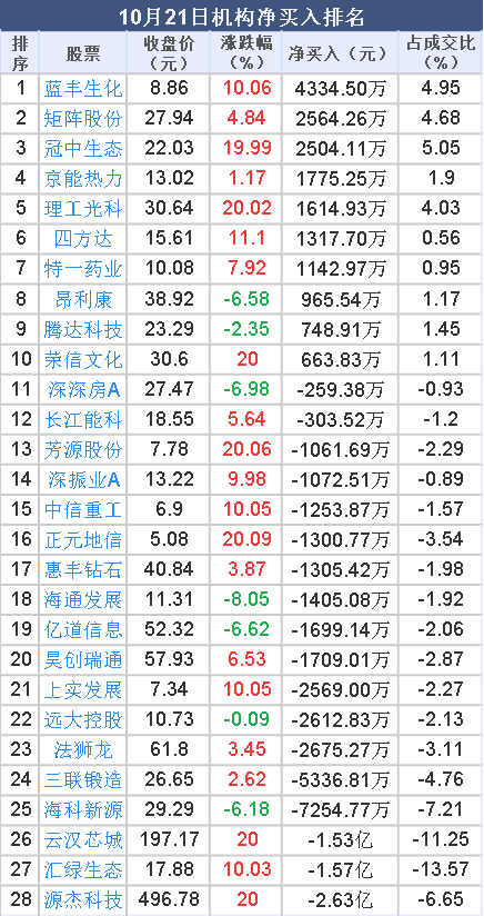 2025年10月21日,大智慧数据中心显示,龙虎榜中机构净卖出7.15亿元。其中,净买入的个股10只,机构净买入较多个股分别是 蓝丰生化 、 矩阵股份 、 冠中生态 等,净买入金额占当日成交额比例达4.95%、4.68%、5.05%。