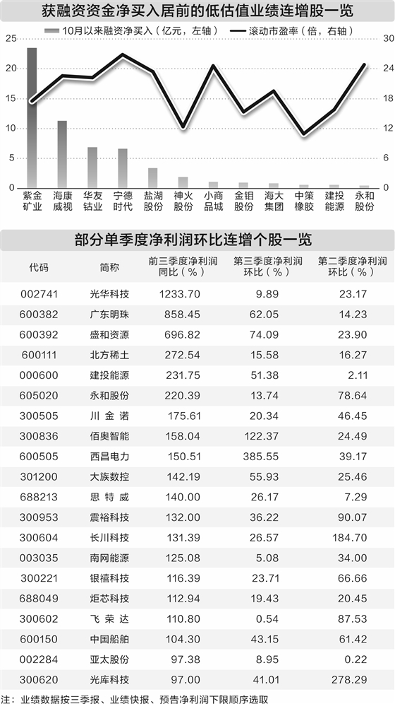 资金面上,部分业绩环比持续提升的低市盈率个股获得融资资金加仓。数据宝统计,10月以来融资资金净买入超1亿元的低估值股有7只,分别为紫金矿业、 海康威视 、 华友钴业 、宁德时代、 盐湖股份 、神火股份、小商品城。紫金矿业融资净买入额23.49亿元,排在第一位。