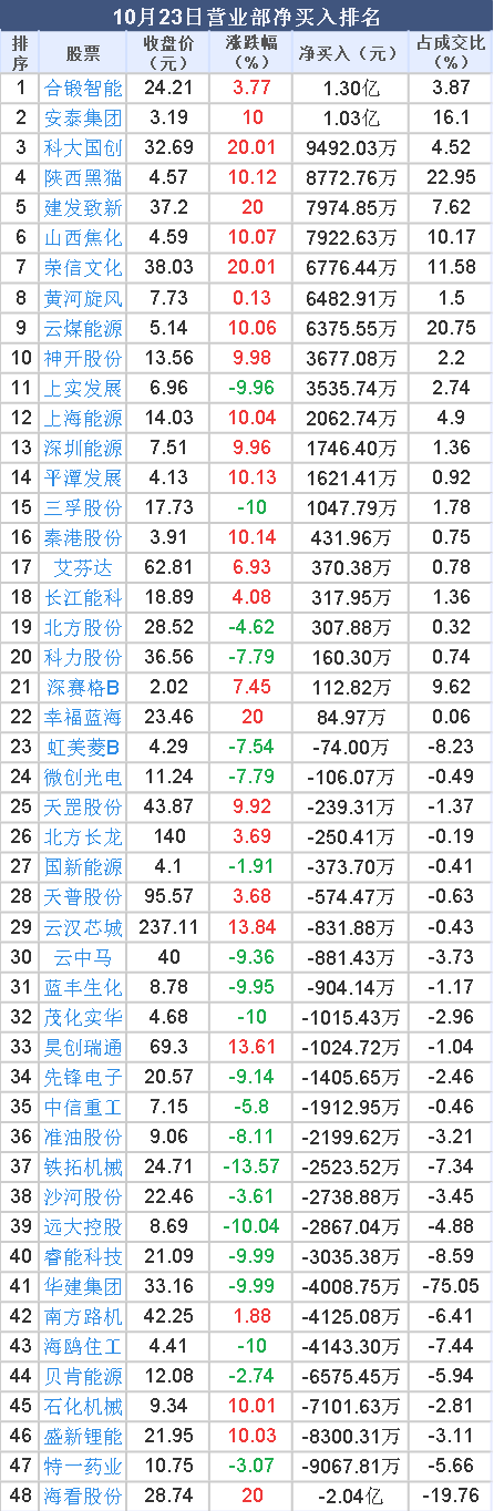 2025年10月23日, 大智慧 数据中心显示,龙虎榜中营业部净买入5940.06万元。其中,净买入的个股22只,营业部净买入较多个股分别是 合锻智能 、 安泰集团 、 科大国创 等,净买入金额占当日成交额比例达3.87%、16.10%、4.52%。