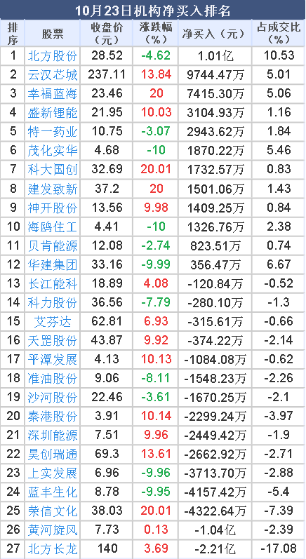 2025年10月23日,大智慧数据中心显示,龙虎榜中机构净卖出1.51亿元。其中,净买入的个股12只,机构净买入较多个股分别是 北方股份 、 云汉芯城 、 幸福蓝海 等,净买入金额占当日成交额比例达10.53%、5.01%、5.06%。