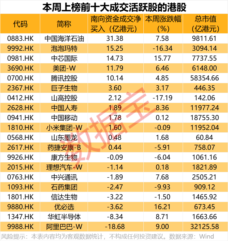 从每日前十大活跃个股来看,本周共有20只个股上榜, 阿里巴巴-W 本周港股通成交总额最高,达到437.94亿港元, 中芯国际 、泡泡玛特本周港股通买卖总额均超过200亿港元。