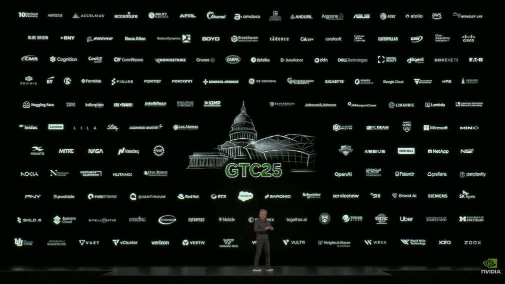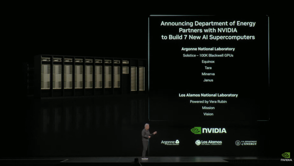 黄仁勋随后宣布与美国能源部达成协议,将再建设7台超级计算机。这些超算将使用Blackwell和下一代Vera Rubin架构芯片,分别配置在阿贡国家实验室和洛斯阿拉莫斯国家实验室。其中名为Solstice的系统将配备10万块Blackwell GPU,将成为“美国能源部用于科学发现的最大AI超级计算机”。