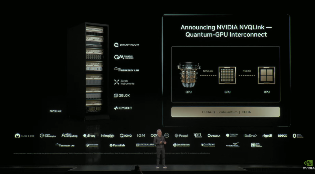 英伟达同时展示了基于CUDA‑Q核心构建的NVQLink,用于连接传统 GPU 和量子计算机,共同加速量子计算。目前的量子计算对环境噪声高度敏感,且可用性有限。因此需要基于GPU的超级计算机承担起量子处理器的部分负载,支持量子纠错所需的控制算法。