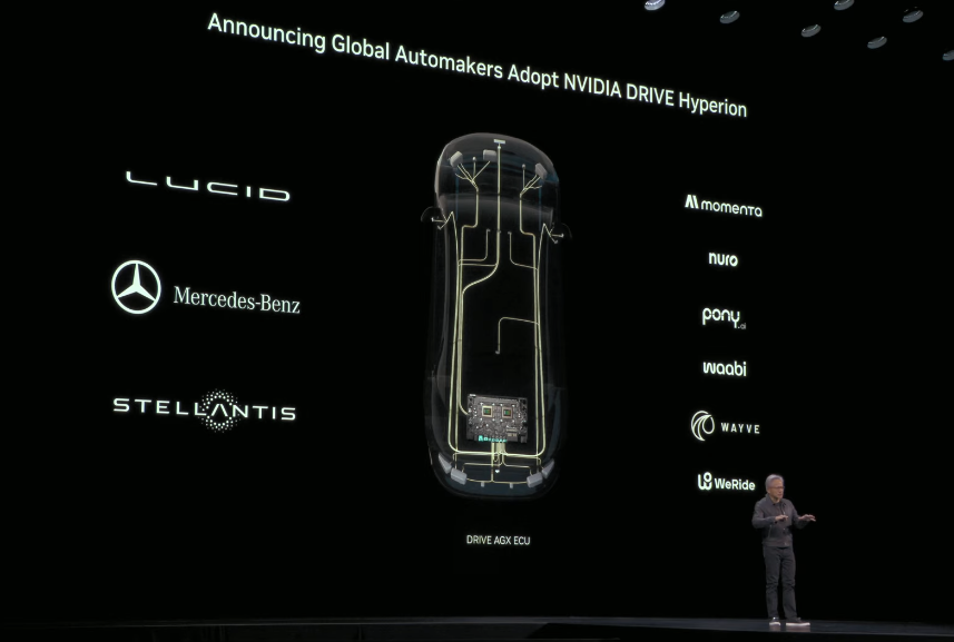 作为演讲的压轴环节,黄仁勋宣布推出NVIDIA DRIVE AGX Hyperion 10,这是一套参考级量产计算平台与 传感器 架构。英伟达宣称,这套系统是面向“L4级自动驾驶”的通用平台,包括14个高清摄像头、9个雷达、1个 激光雷达 和12个超声传感器,以及两台基于Blackwell架构的车载DRIVE AGX Thor平台。