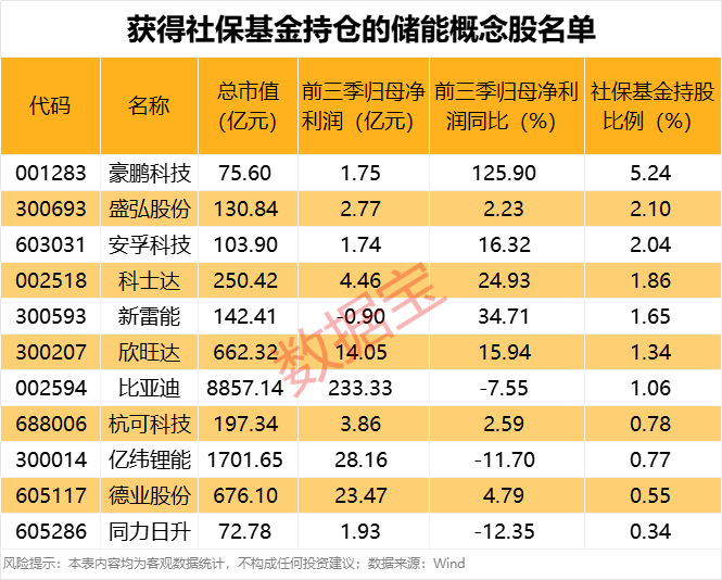 截至三季度末,11只储能概念股获得社保基金持仓,豪鹏科技、 盛弘股份 、 安孚科技 、 科士达 等持股比例居前。