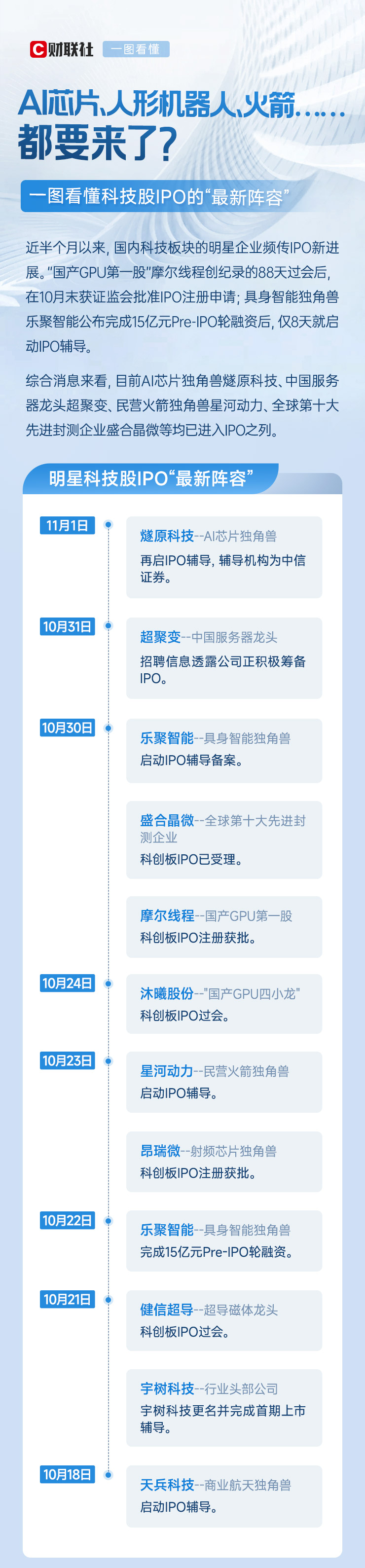 ①科技板块明星企业IPO频传新进展,乐聚智能完成15亿元Pre-IPO轮融资后8天启动IPO辅导备案。②燧原科技、超聚变、星河动力、盛合晶微等也已进入IPO之列。③尚处IPO进程中的明星科技企业涵盖了 AI芯片 、 服务器 、火箭和先进封测等领域。