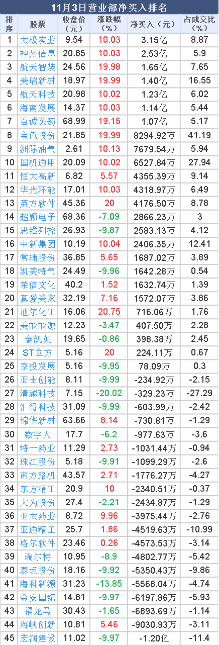 2025年11月3日, 大智慧 数据中心显示,龙虎榜中营业部净买入9.87亿元。其中,净买入的个股25只,营业部净买入较多个股分别是 太极实业 、 神州信息 、 航天智装 等,净买入金额占当日成交额比例达8.87%、5.90%、7.65%。