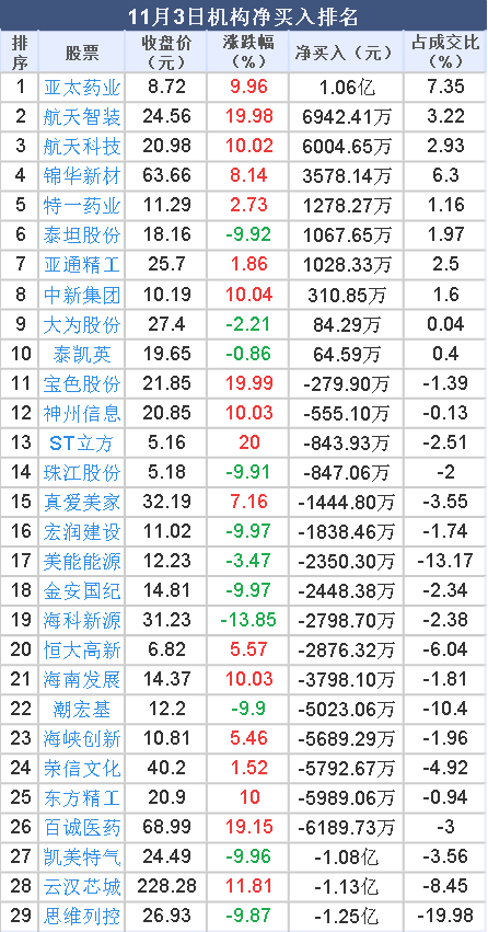 2025年11月3日,大智慧数据中心显示,龙虎榜中机构净卖出5.24亿元。其中,净买入的个股10只,机构净买入较多个股分别是 亚太药业 、航天智装、 航天科技 等,净买入金额占当日成交额比例达7.35%、3.22%、2.93%。