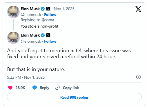 马斯克在帖子中表示,奥尔特曼忘记提及后续的剧情,他在24小时内就收到了退款。但这很符合他的性格。