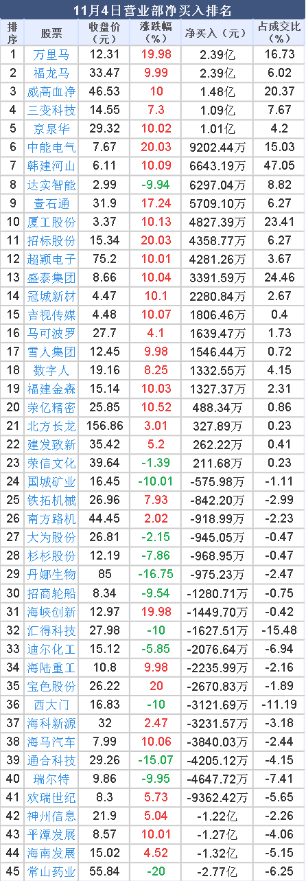 2025年11月4日, 大智慧 数据中心显示,龙虎榜中营业部净买入2.89亿元。其中,净买入的个股23只,营业部净买入较多个股分别是 万里马 、 福龙马 、 威高血净 等,净买入金额占当日成交额比例达16.73%、6.02%、20.37%。