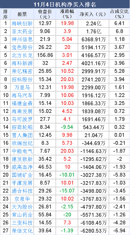 2025年11月4日,大智慧数据中心显示,龙虎榜中机构净买入3.52亿元。其中,净买入的个股15只,机构净买入较多个股分别是 海峡创新 、 亚太药业 、 神州信息 等,净买入金额占当日成交额比例达6.41%、6.80%、1.18%。