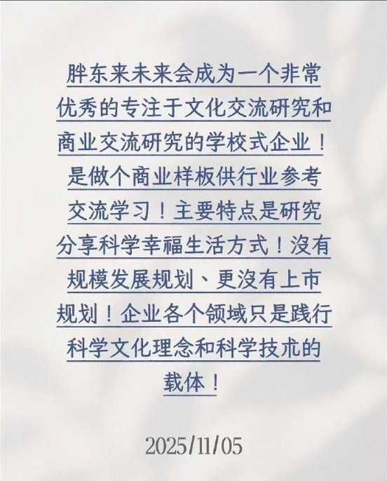 11月5日,胖东来创始人于东来在社交平台发文称:“(胖东来)没有规模发展规划、更没有上市规划!”