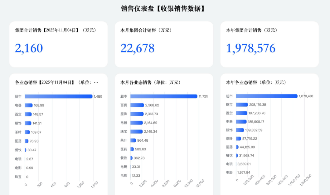 记者查阅胖东来官网注意到,截至11月4日,胖东来今年合计销售额已达197.86亿元,其中,超市业务占据销售大头,销售额达107.85亿元,珠宝、百货、电器等业态紧随其后。