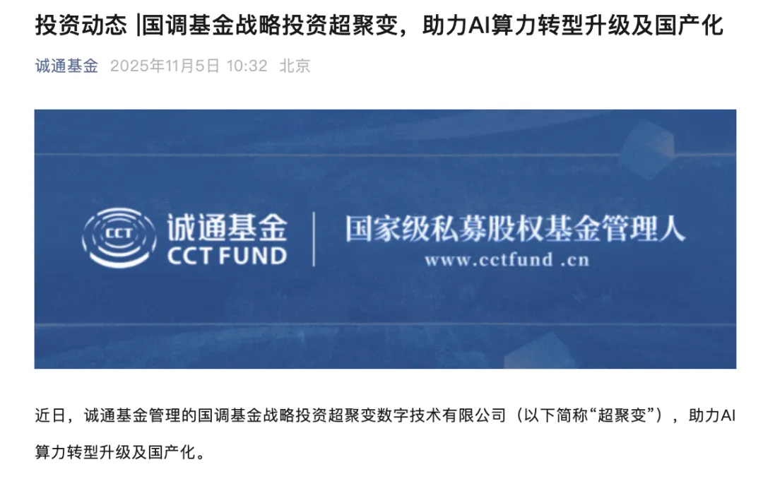 据诚通基金官微消息,其管理的国调基金于近日战略投资了超聚变。该基金是由中国诚通控股集团牵头设立的国家级基金,此前在 半导体 领域曾参与投资 中芯国际 、华芯鼎新等企业。