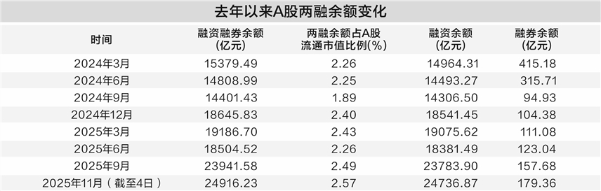 11月4日,A股两融余额占流通市值的比例达2.57%,至此已连续19个交易日维持在2.5%以上。截至当日,A股两融余额约为24916亿元。