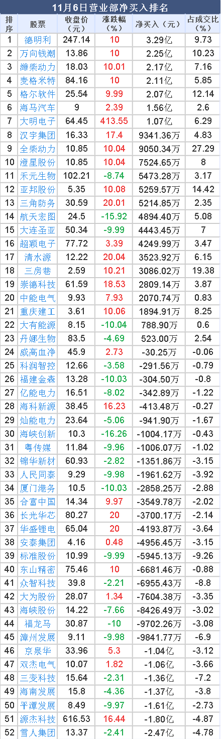 2025年11月6日, 大智慧 数据中心显示,龙虎榜中营业部净买入2.61亿元。其中,净买入的个股23只,营业部净买入较多个股分别是 德明利 、 万向钱潮 、 潍柴动力 等,净买入金额占当日成交额比例达9.73%、10.23%、7.16%。