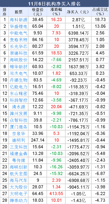 2025年11月6日,大智慧数据中心显示,龙虎榜中机构净买入1659.48万元。其中,净买入的个股9只,机构净买入较多个股分别是 海科新源 、 华盛锂电 、 中能电气 等,净买入金额占当日成交额比例达18.73%、13.06%、2.56%。
