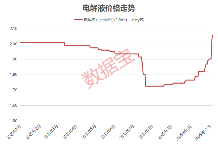8月以来,电解液和六氟磷酸锂价格触底反弹,行业景气度明显回升。Wind数据显示,电解液(三元圆柱)11月7日价格为2.06万元/吨,较8月初的年内低点上涨19.08%,六氟磷酸锂11月7日价格为11.9万元/吨,较7月的4.93万元/吨涨幅达到141.38%,六氟磷酸锂作为电解液的关键原料,其价格上涨对电解液涨价起到明显的促进作用。