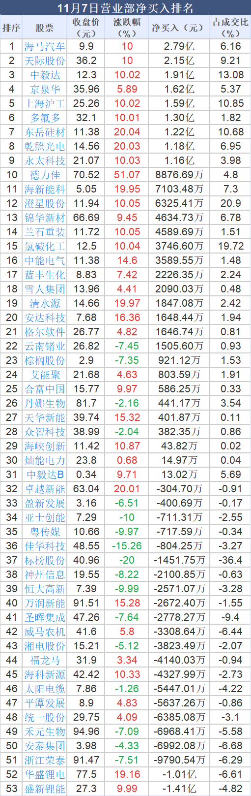 11月7日, 大智慧 数据中心显示,龙虎榜中营业部净买入10.69亿元。其中,净买入的个股31只,营业部净买入较多个股分别是 海马汽车 、 天际股份 、 中毅达 等,净买入金额占当日成交额比例达6.16%、9.21%、13.08%。
