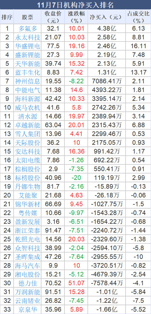 龙虎榜中机构净买入11.04亿元。其中,净买入的个股18只,机构净买入较多个股分别是 多氟多 、 永太科技 、华盛锂电等,净买入金额占当日成交额比例达6.13%、8.81%、16.11%。
