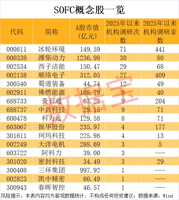 今年以来 SOFC概念 股均获得至少1次机构调研。据数据宝统计,年内机构调研10次以上的概念股有5只,分别是冰轮环境、潍柴动力、 西子洁能 、顺络电子、 蜀道装备 。