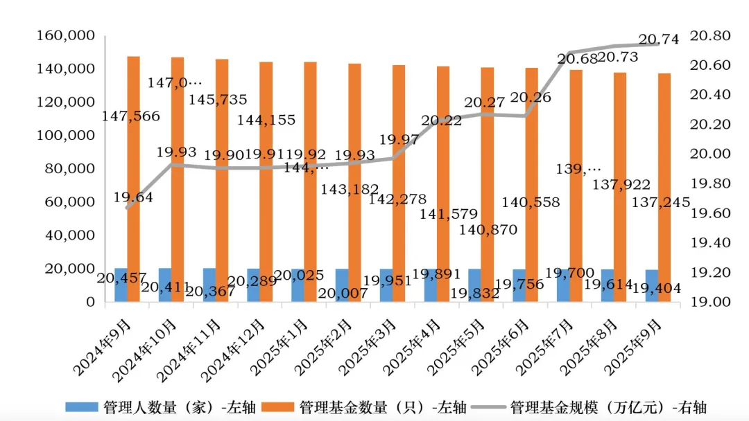 截至9月末,存续私募基金规模20.74万亿元。其中,存续私募证券投资基金规模为5.97万亿元,相较于8月末再度增加。