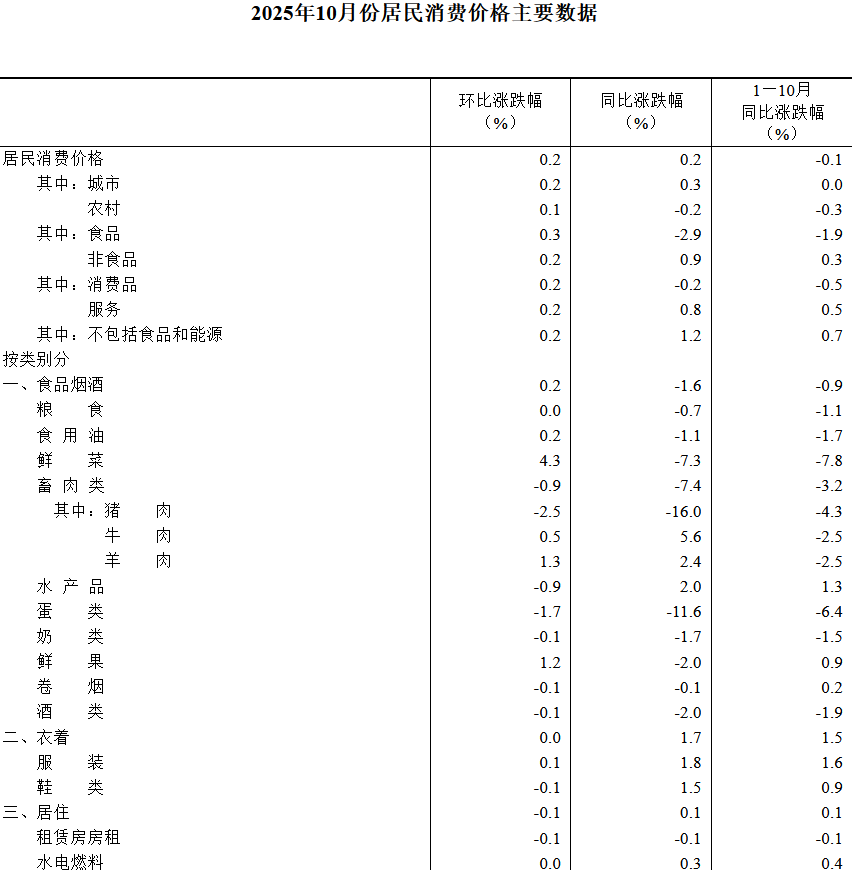2025年10月份,全国居民消费价格同比上涨0.2%。其中,城市上涨0.3%,农村下降0.2%;食品价格下降2.9%,非食品价格上涨0.9%;消费品价格下降0.2%,服务价格上涨0.8%。1—10月平均,全国居民消费价格比上年同期下降0.1%。