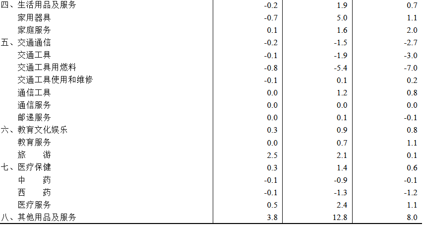 其他七大类价格同比六涨一降。其中,其他用品及服务、生活用品及服务、衣着价格分别上涨12.8%、1.9%和1.7%,医疗保健、教育文化娱乐、居住价格分别上涨1.4%、0.9%和0.1%;交通通信价格下降1.5%。