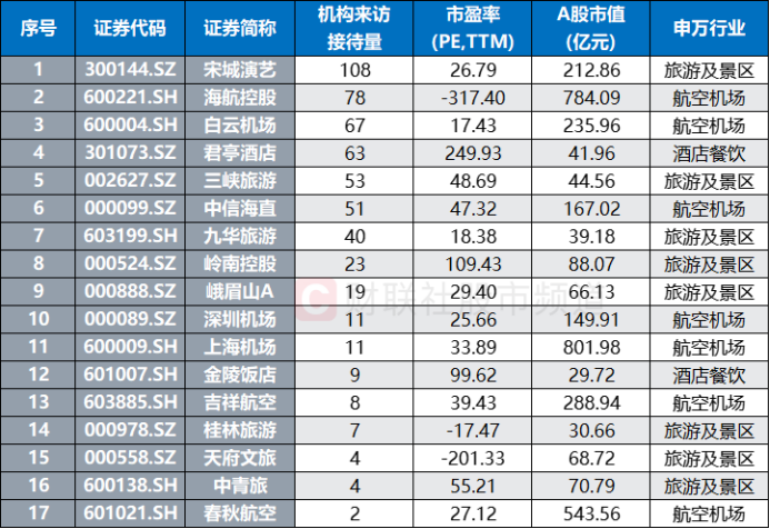 注:年内机构调研量居前的旅游、酒店、出行相关标的(截至11月7日数据)