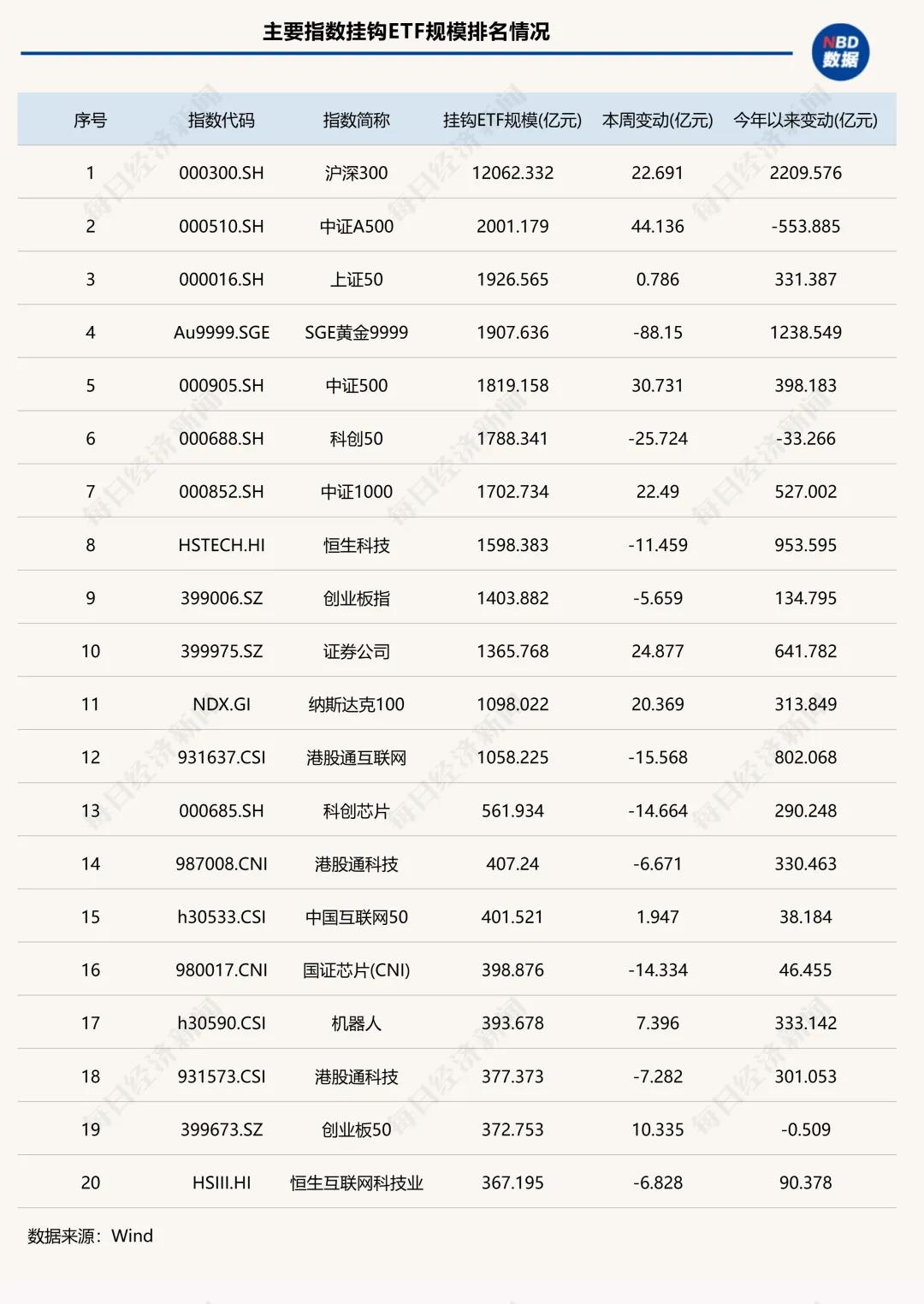 从年内规模增长来看,沪深300指数和SGE黄金9999指数挂钩ETF规模分别增长2220.64亿元和1246.35亿元。另一方面,虽然中证A500指数本周表现不错,但今年以来挂钩ETF规模仍缩水超530亿元,科创50指数挂钩ETF规模年内减少额扩大至56.77亿元。