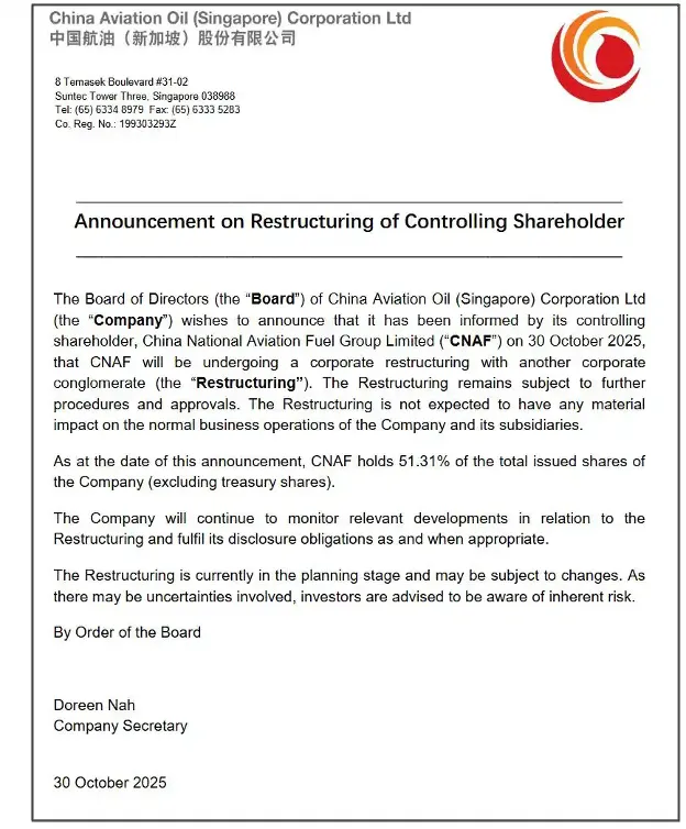 近日,中国航空油料集团有限公司(简称“中国航空油料集团”)旗下中国航油(新加坡)股份有限公司发布公告称,中国航油(新加坡)股份有限公司董事会于2025年10月30日收到控股股东中国航空油料集团通知,中国航空油料集团将与另一家企业集团进行重组。