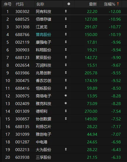 11月14日,A股存储芯片板块开盘大跌,热门概念股纷纷下跌。至收盘, 同有科技 、佰维存储、江波龙、普冉股份等4只个股跌幅超过10%; 康强电子 、 兆易创新 、 香农芯创 、 德明利 等13只个股跌幅超过7%。